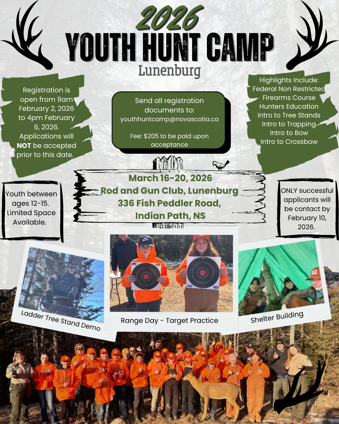 Announcing the Youth Hunt Camp to be held at Lunenburg Rod and Gun Club, March 16th to 20th 2026. The program details, registration form and instructions are included. The program will be oversubscribed so please follow the instructions closely.